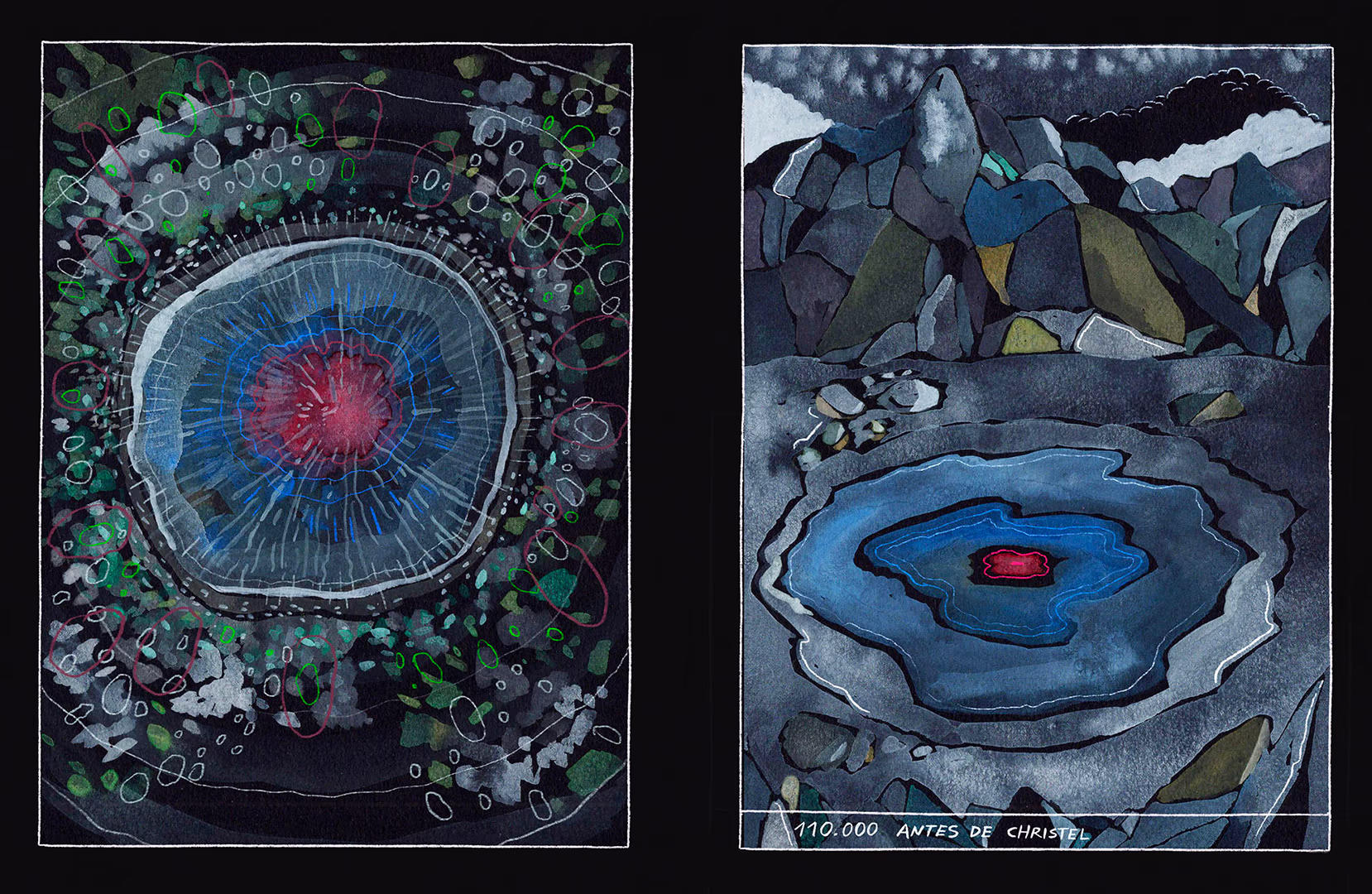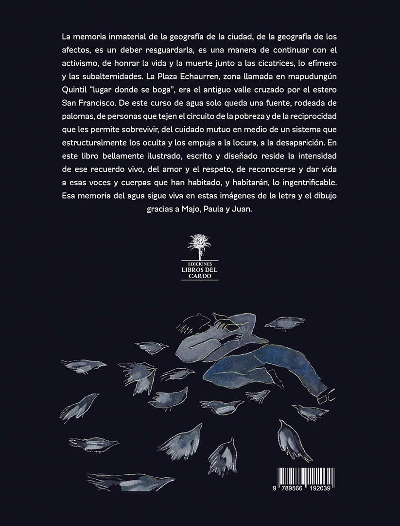 La memoria inmaterial de la geografía de la ciudad, de la geografía de los afectos, es un deber resguardarla, es una manera de continuar con el activismo, de honrar la vida y la muerte junto a las cicatrices, lo efímero y las subalternidades. La Plaza Echaurren, zona llamada en mapudungún Quintil “lugar donde se boga”, era el antiguo valle cruzado por el estero San Francisco. De este curso de agua solo queda una fuente, rodeada de palomas, de personas que tejen el circuito de la pobreza y de la reciprocidad que les permite sobrevivir, del cuidado mutuo en medio de un sistema que estructuralmente los oculta y los empuja a la locura, a la desaparición. En este libro bellamente ilustrado, escrito y diseñado reside la intensidad de ese recuerdo vivo, del amor y el respeto, de reconocerse y dar vida a esas voces y cuerpas que han habitado, y habitarán, lo ingentrificable.