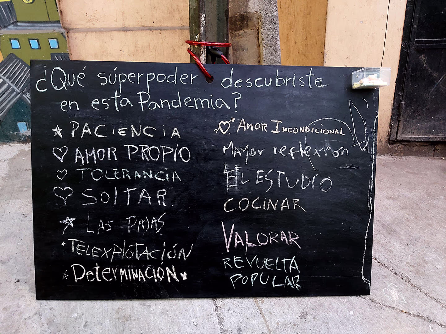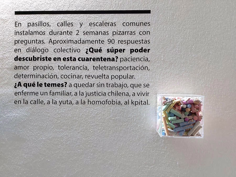 En pasillos, calles y escaleras comunes instalamos durante 2 semanas pizarras con preguntas. Aproximadamente 90 respuestas en diálogo colectivo ¿Qué súper poder descubriste en esta cuarentena? paciencia, amor propio, tolerancia, teletransportación, determinación, cocinar, revuelta popular. ¿A qué le temes? a quedar sin trabajo, que se enferme un familiar, a la justicia chilena, a vivir en la calle, a la yuta, a la homofobia, al capital.